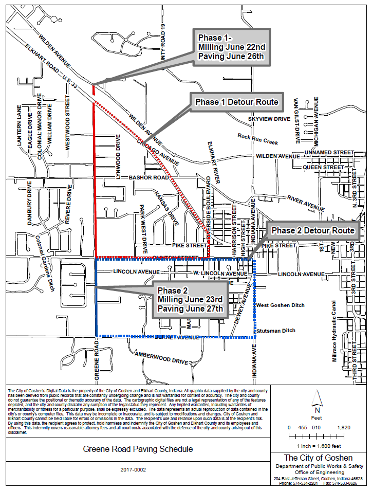 Tuesday, June 26: Paving Greene Road from Elkhart Road (US 33) to Wilden Avenue and Elkhart Road to Clinton Street. The detour will be Elkhart Road to Riverside Boulevard to Clinton Street
