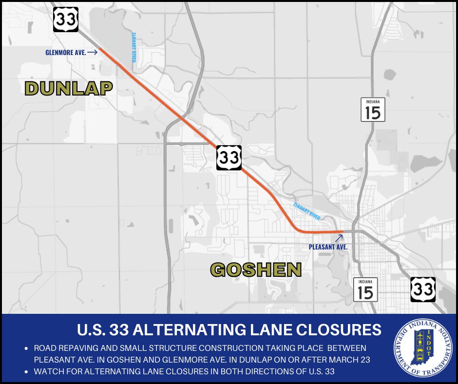 U.S. 33 construction between Goshen and Dunlap begins March 23