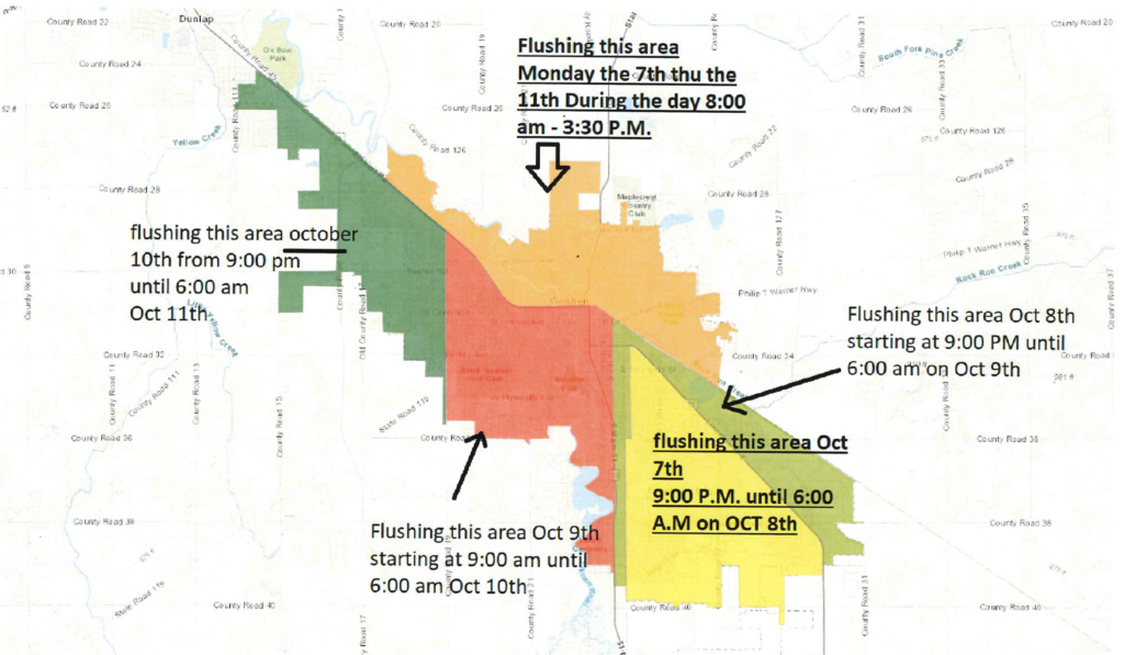 On Tuesday, Oct. 8 they will start flushing from 9 p.m. to 6 a.m. between Cottage Avenue and 10th Street between Norfolk Southern tracks south to the city limits, and from Lincolnway East and the Norfolk Southern tracks heading east to the city limits.
