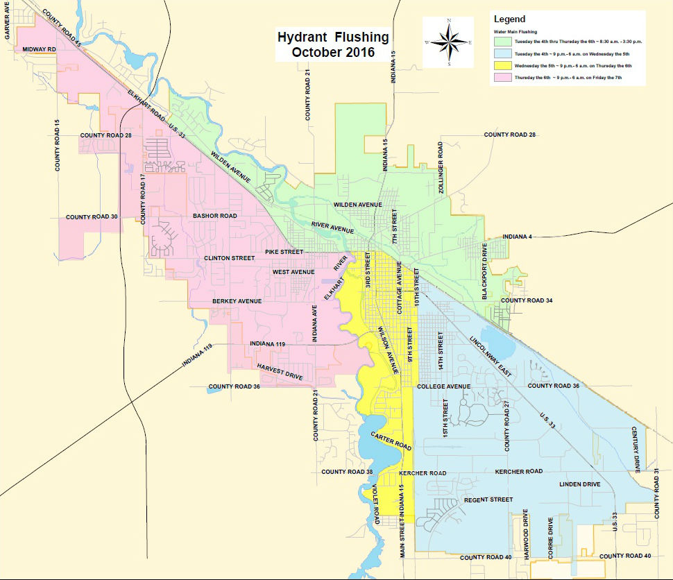 From 9 p.m. Thursday to 6 a.m.Friday, they will be flushing between Elkhart Road (U.S. 33) to the city limits south and between the Elkhart River to the city limits west including Weaver Woods and Harrison Ridge subdivisions as well as Bashor Children’s Home which are out of city limits.