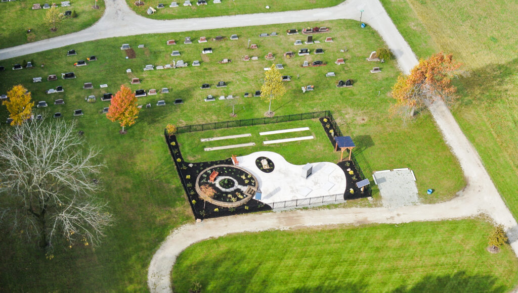 The Garden was conceived by Goshen City Cemeteries staff as a way to offer new, affordable options to the increasing number of families choosing cremation. The design seeks to strike a balance between beauty and dignity on one hand and economy on the other. The project was built using the expertise of local tradesmen and vendors and in some cases, local materials. Many of the landscape boulders used, for example, were dug out on the cemetery grounds.