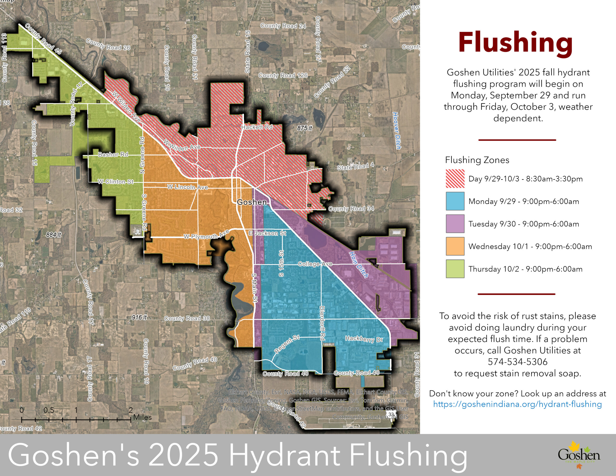GOSHEN, Ind. — Goshen Utilities will conduct its fall hydrant flushing program from Monday, Sept. 29, through Friday, Oct. 3, 2025, weather permitting.