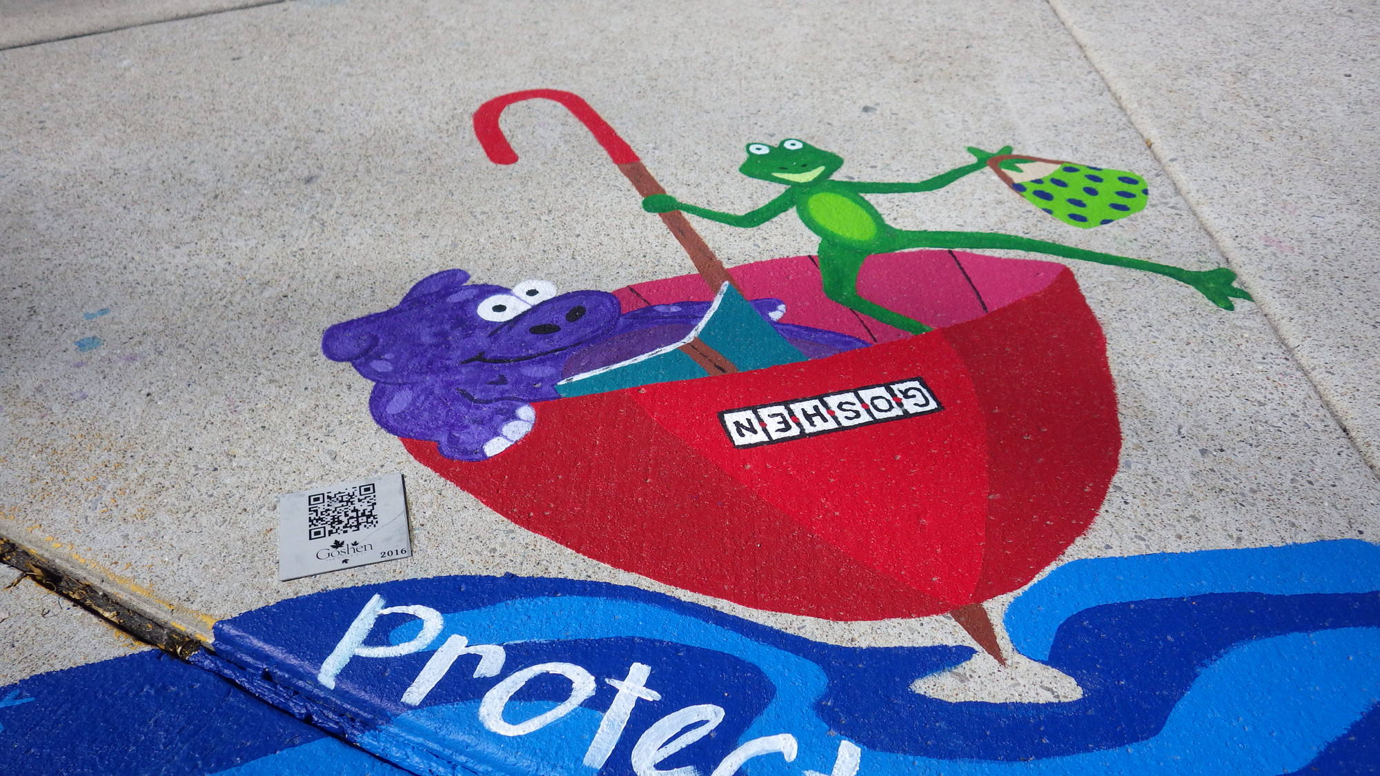 The City of Goshen Stormwater Management Department decided to combine Goshen’s love for art with stormwater and created a 1.2-mile Storm Drain Art Walk from the Goshen Public Library to the Goshen Farmers Market on Washington Street featuring eight murals created by 10 artists was created. However, over time these murals have chipped and peeled away leaving only a few murals left, and these will eventually disappear to as street art is known to do. Fortunately, the artwork is preserved here and more information on each artist, their mural, and where it is or was located can be found below by clicking on the artist(s) name(s) and looking at the map at the end.