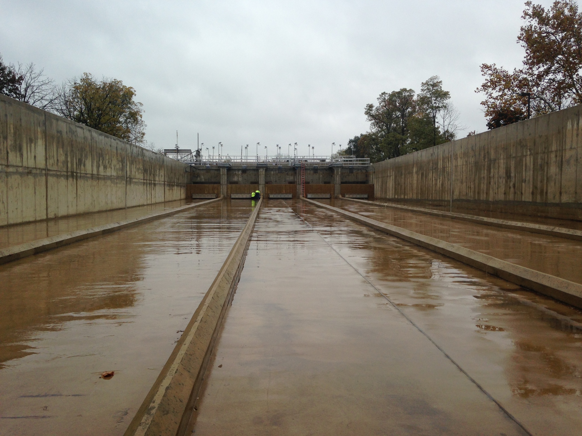 Once the flow enters the facility, it goes through 90″ grinders which are the largest currently made. It is then pumped through 4 RCS (raw combined sewage) pumps that are rated at 53 MGD each. The water is treated with Sodium Hyochlorite for disinfection before it travels into 2 tanks that can hold approximately 2.5 million gallons each. If the facility reaches its storage capacity, the water is de-chlorinated with Sodium Bisulfite before discharging into the Elkhart River.