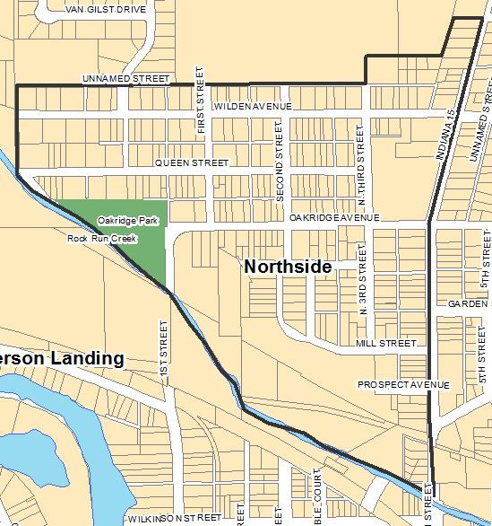 Boundaries: Main Street to the east, Rock Run Creek to the south and west, Wilden Avenue to the north (both sides)