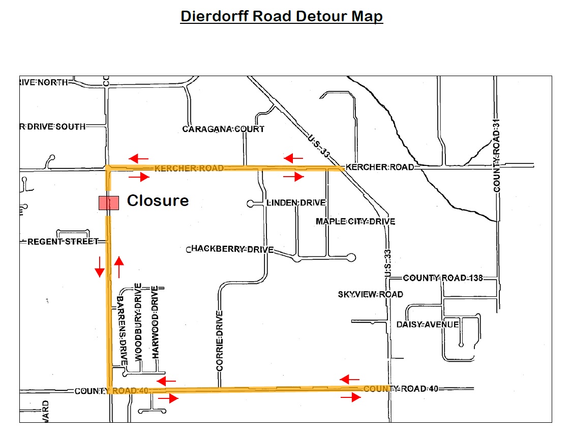 A detour will be marked with both barricades and signs directing traffic to US 33 from Kercher Road and CR 40.