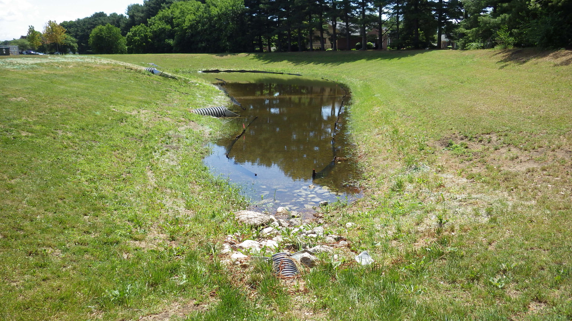 Photo: A stormwater basin holding water during dry weather. Overtime, and depending on stormwater management practices elsewhere on the property, fine sediment like silt can seal the bottom of basins and prevent them from draining. This can create an unsightly and mosquito-prone area, but it can also reduce the volume capacity of the basin. During major rain events, the basin might not be able to hold the amount of water it was designed to accommodate. A well functioning basin should drain dry within 24 hours.