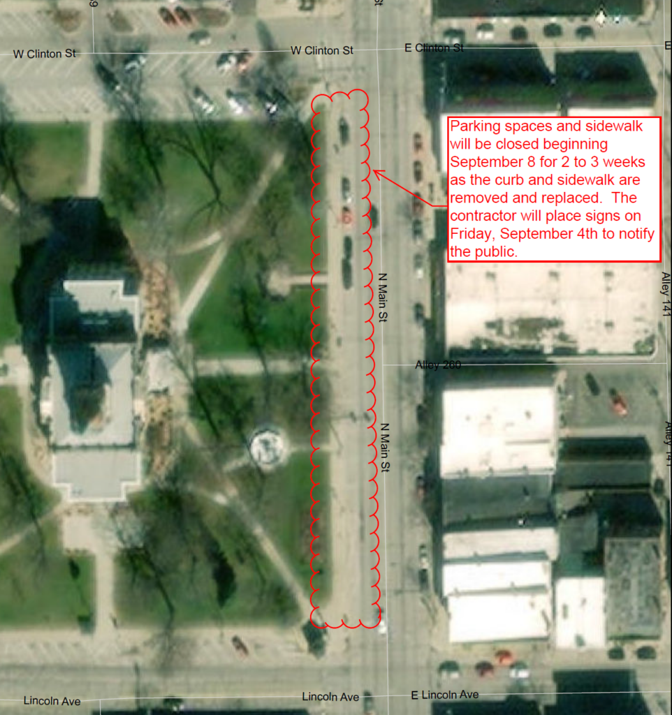 Street parking along the west side of Main Street, between Lincoln Avenue and Clinton Street, is closed beginning Tuesday, September 8, until Tuesday, September 29.
